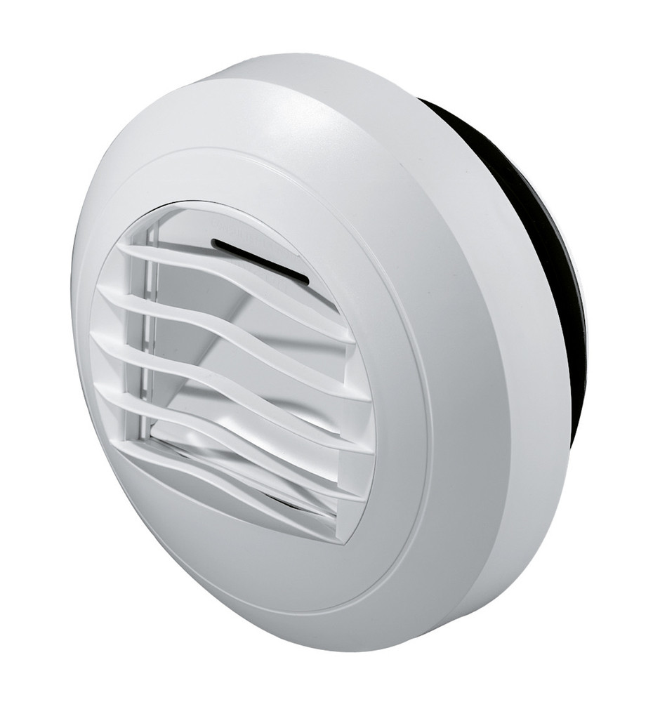 Abluftautomat mit variablem, feuchteabhängig gesteuertem Volumenstrom. Elektr. zeitgesteuerte Bedarfslüftungsstufe über bauseit. Taster, Rückstellung autom. nach ca. 30 Min. Aus Kunststoff, weiß, zum Einschub in Rohre mit ND 125 mm. Automat. Regelung des Vol.-Stroms abhängig von rel. Raumfeuchte zw. min. und max. Begrenzung. Für Wand-/Deckeneinbau. 230 V, 0,5 A, 3 W, IP X1, Schutzklasse II.