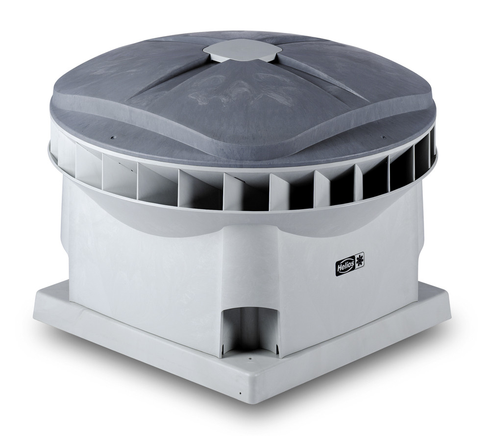 Dachventilator mit EC-Technologie. Aerodynamisch gestaltetes Gehäuse aus hochwertigem Polypropylen in grau, diagonal ausblasend. Betriebsbereich von -30 bis +80 °C. Integrierte Leitschaufeln für optimalen Wirkungsgrad. Für waagerechte Montage. Diagonallaufrad aus Aluminium, Motor-Laufrad-Einheit dynamisch ausgewuchtet. Elektronisch kommutierter Gleichstrom-Außenläufer-Motor mit Kugellager für Dauerbetrieb. Hoher Wirkungsgrad auch bei Regelbetrieb. Wartungs- und funkstörfrei. Integrierte Drucksteuerung für Druckkonstanthaltung bei Lüftung mit wahlweise veränderlichen Volumenströmen.