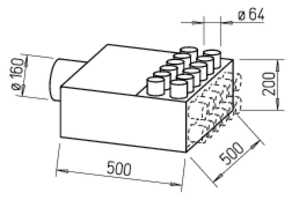 Zum Anschluss von bis zu 12 Lüftungsrohren, DN 63. Durch schallabsorbierende Auskleidung der Innenseiten gleichzeitig als Schalldämpfer-Element wirkend. Endstück mit Anschlussstutzen um 180° versetzbar, dadurch Montage als Durchgangs- oder 90°-Verteiler möglich. Aus verzinktem Stahlblech, korrosionsfest.