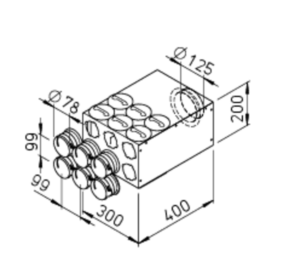 FlexPipe Verteilerkasten. 6 Einzelstutzen Rund 75. Anschluss DN 125. FlexPipe-plus Verteilerkasten zum Anschluss von bis zu 6 runden Lüftungsrohren FRS-R 75. Mit schallabsorbierender, glattflächiger Auskleidung der Innenseiten und großer Revisionsöffnung. 12 Anschlussmöglichkeiten für bis zu 6 runde Lüftungsrohre FRS-R 75 durch beiliegende Bajonett-Einzelstutzen. Montage der Stutzen ist waagrecht, senkrecht oder in Kombination möglich. Innenauskleidung: PU-Schaum, foliert.