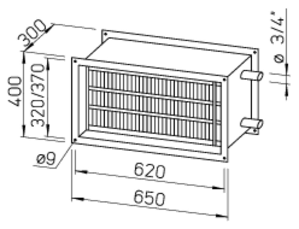 Warmwasser-Heizregister mit beidseitigen Kanal-Flanschen. Gehäuse aus verzinktem Stahlblech. Wärmetauscher: versetzt angeordnete Kupferrohre mit Aluminiumlamellen. Betriebstemperatur max. 100 °C, Betriebsdruck max 8 bar. Wasseranschlussrohre mit Außengewinden.