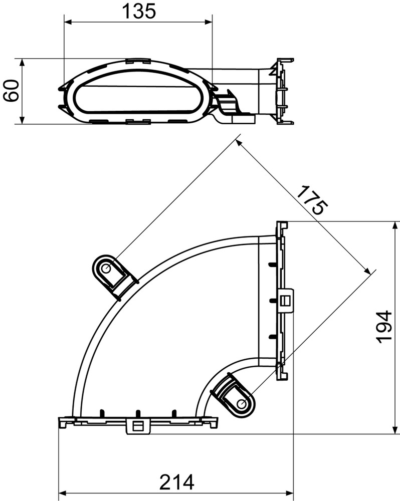 Kanalbogen 90° aus Kunststoff. Ausführung flach. Mit Anschlussmöglichkeit für flexibles Flachrohr. Lieferumfang: 1 Kanalbogen, 2 einzelne Adapter Rohrbefestigungen (FFS-RA)Artikel: FFS-BH90, Volumenstrom: 15 m3/h / 30 m3/h / 45 m3/h / bei 0,9 Pa / 3,7 Pa / 8,4 Pa, Gewicht: 0,282 kg, Breite: 214 mm, Höhe: 60 mm, Tiefe: 175 mm