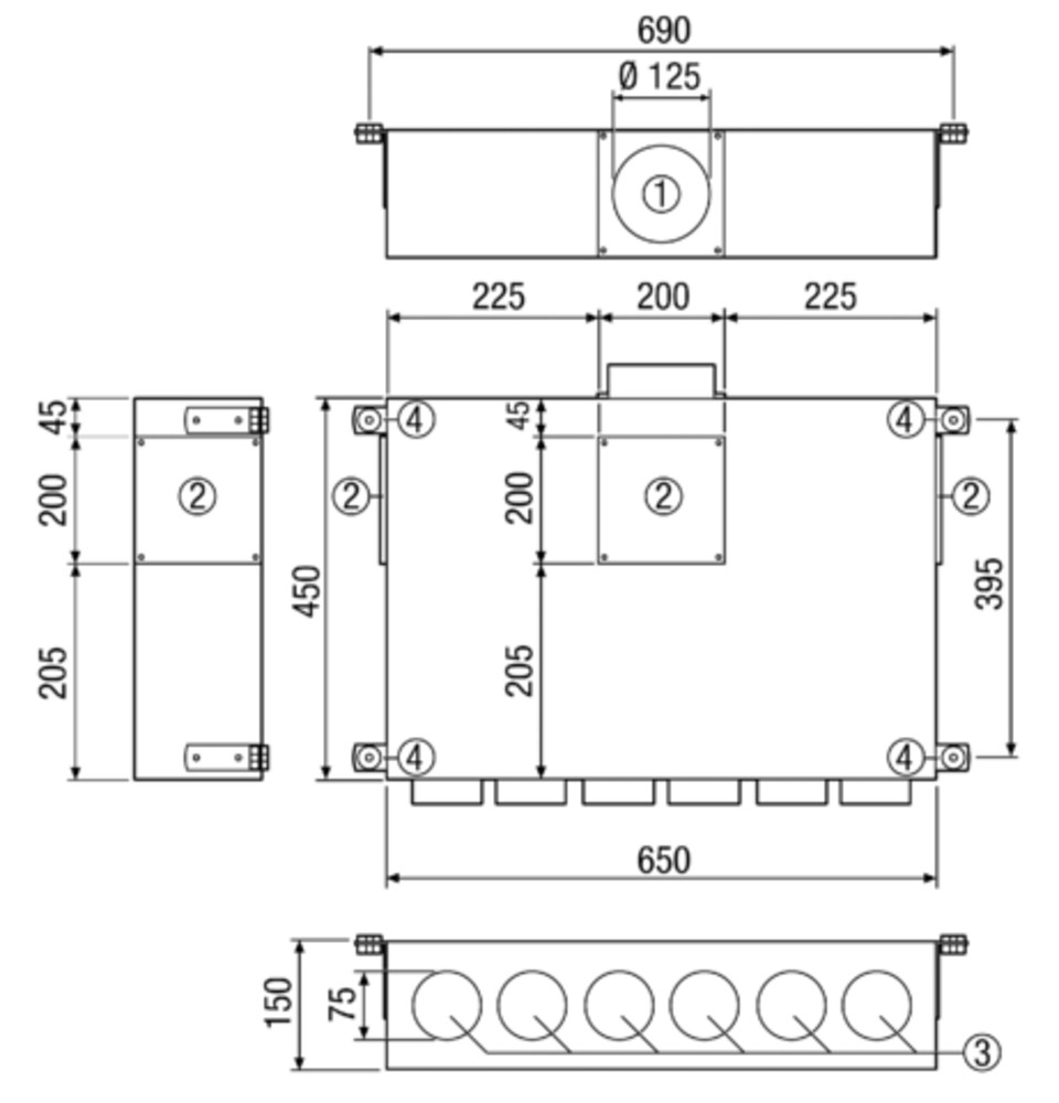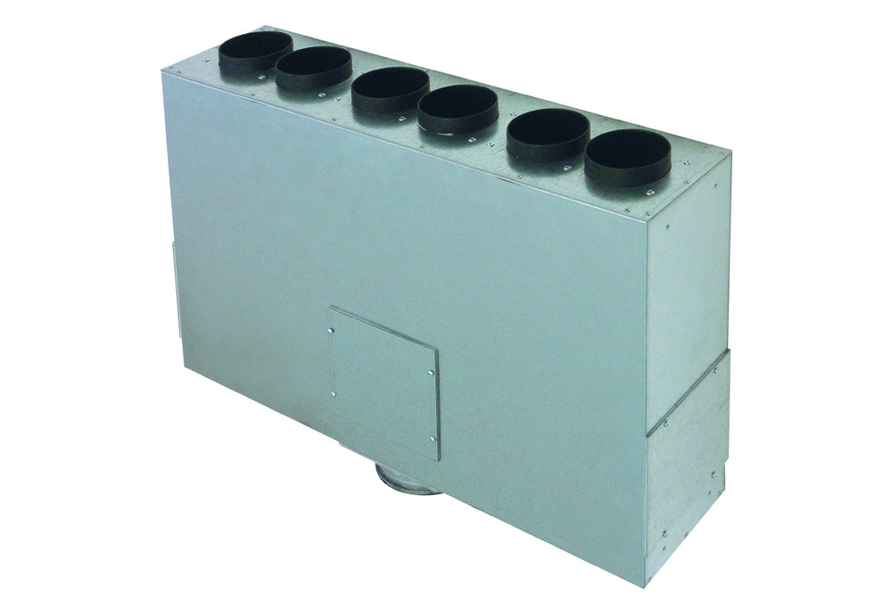 Luftverteiler-Kasten aus Blech mit schallgedämmer Innenauskleidung. Frontblechplatte versehen mit integrierten Kunststoff-Einschubadaptern MF-WE für den passgenauen und schnellen Einschub der Flexrohre MF-F. Bei der Auslieferung sind jeweils die Hälfte der Einschubadapter mit Verschlusskappen versehen. Ausgestattet mit 4 Gummi-Befestigungswinkeln für schallentkoppelte Wand-/ Deckenmontage. 3 demontierbare Revisionsanschlussplatten (2 x seitlich, 1 unten am Verteilerkasten). Stirnseitiger Hauptrohranschluss (NW 125/NW 160) kann versetzt werden auf Revisionsanschlussplatten. Einsatz als Durchgangs-bzw. 90°-Verteiler. Notwendiges Zubehör: Dichtungsringe MF-FDR.Artikel: MF-BV75-125-6, Luftrichtung: Be- oder Entlüftung, Volumenstrom: 180 m3/h / empfohlen, Material: Stahlblech, verzinkt, Gewicht: 9,3 kg, Anschlussdurchmesser: 125 mm, Anschlussdurchmesser Flexrohr: 75 mm, Anzahl Anschlussstutzen: 6, Breite: 650 mm, Höhe: 150 mm, Tiefe: 450 mm