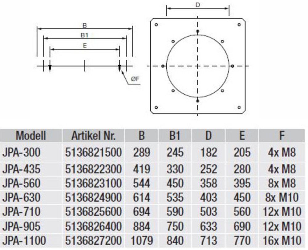 Anschlussplatte JPA-560 -Anschlussplatte aus Stahlblech, verzinkt -Mit Gewindebolzen zum Anschluss von saugseitigen Rohrbauteilen (z.B. Gegenflansch) Fabrikat: S&P Deutschland GmbH Typ: JPA-560 Artikel-Nr.: 5136823100