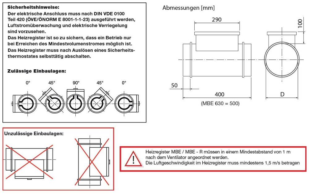 Elektro-Heizregister MBE-100/04 B -Gehäuse aus verzinktem Stahlblech -Anschluss-Stutzen NW-100 -Heizelemente aus Edelstahl -Schutzart: IP 43 -Versorgungsspannung: 1ph. 230V, 50Hz -Sicherheitsthermostat B selbsttätig zurückstellend (60GradC) -Sicherheitsthermostat C mit manueller Rückstellung (120GradC) Technische Daten: Heizleistung: 0,4 KW Max. Stromaufnahme: 1,7 A Min. Volumenstrom: 43 m3/h Max. Austrittstemp.: 40 GradC Gewicht: 2,0 kg Fabrikat: S&P Deutschland GmbH Typ: MBE-100/04 B Artikel-Nr.: 5211800700