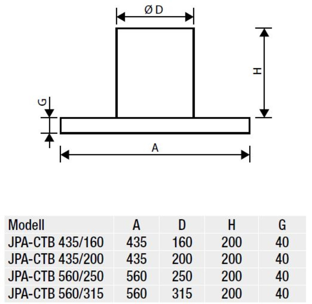 Grundplatte, Anschlussstutzen für CTB JPA-CTB 435/160 -Grundplatte mit Anschlussstutzen (Höhe 200 mm) als Adapter für den direkten Anschluss des Dachventilators CTB am Dachsockel -Anschlussstutzen in den passenden Nennweiten zum Einstecken des Dach- ventilators -Montage Grundplatte auf den Dach- sockeln JBS und JBS-S sowie am Sockelschalldämpfer JAA -Stahlblech, verzinkt Fabrikat: S&P Deutschland GmbH Typ: JPA-CTB 435/160 Artikel-Nr.: 8070404275