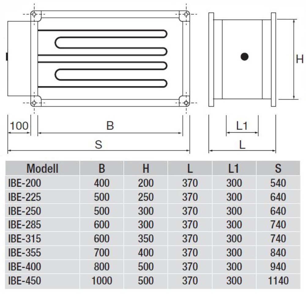 Elektro-Heizregister IBE-285/20T -Gehäuse aus verzinktem Stahlblech mit genormten Kanalflansch-Profilen -Heizelemente aus Edelstahl (230V - 3W/cm2) -Schutzklasse IP 43 -Drehstrom 3ph. 400 V, 50 Hz -Sicherheitsthermostat B selbsttätig -Sicherheitsthermostat C mit manuellem RESET Technische Daten: Heizleistung: 20,0 kW Schaltgruppen: 3x6,7 kW Stromaufnahme max.: 28,9 A Volumenstrom min.: 980 m3/h Austrittstemp. max. 40 GradC Kanalabmessungen: 600 x 300 mm Gewicht: 19,5 kg Fabrikat: S&P Deutschland GmbH Typ: IBE-285/20 T Artikel-Nr.: 5132834200