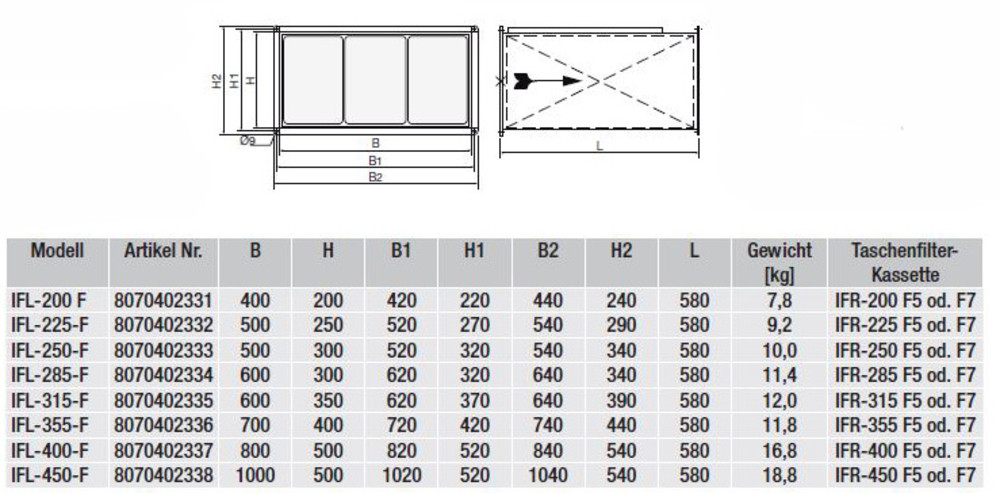 Kanal-Luftfilterbox IFL-250 F Leergehäuse für Taschenfilterkassetten IFR-250 M5 oder IFR-250 F7 -Gehäuse aus verzinktem Stahlblech -Genormte Kanalflansch-Profile für Lüftungskanäle 500 x 300mm -Leicht aufklappbarer Deckel zum Filterwechsel -Montage in beliebiger Einbaulage Gewicht: 10,0 kg Fabrikat: S&P Deutschland GmbH Typ: IFL-250 F Artikel-Nr.: 8070402333