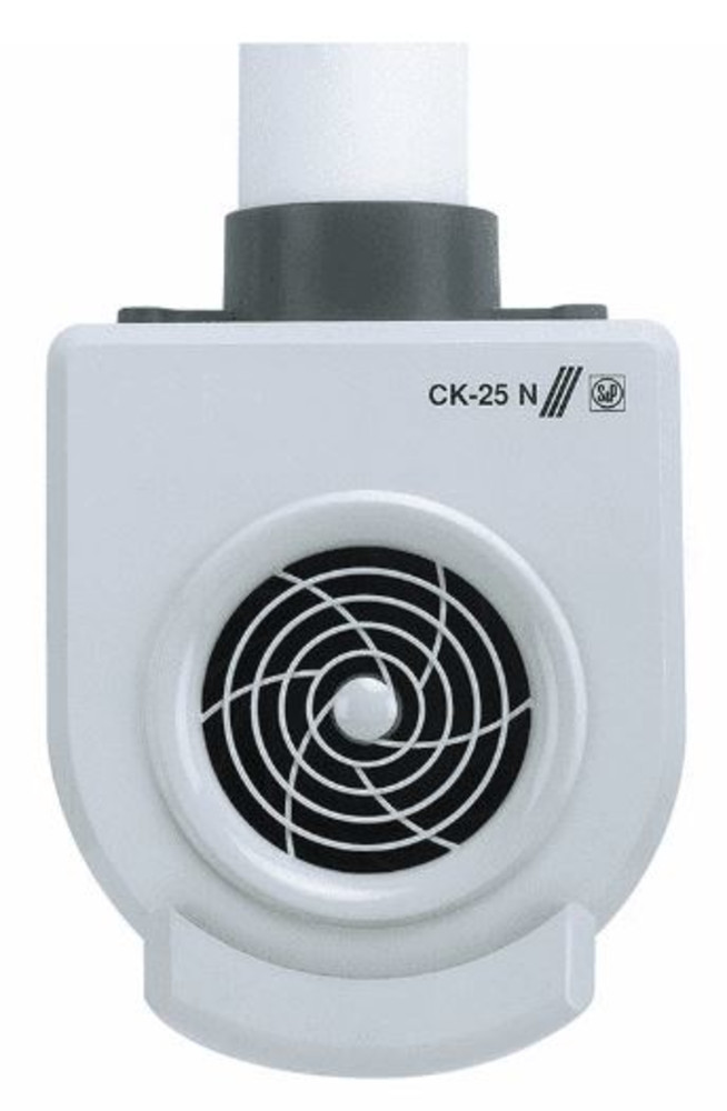 Radial-Ventilator CK-25 N -Gehäuse aus Kunststoff -Freie Ansaugung mit Schutzgitter -Ausblasstutzen NW 100 -Radial-Laufrad aus Kunststoff, statisch und dynamisch ausgewuchtet -Motor Wechselstrom 230V 50Hz -Isolierklasse II -Motorbemessung Dauerbetrieb S1 -Geschlossene Kugellager - wartungsfrei -Mit Thermokontakten ausgestattet, manuelle Rückstellung gemäß EN 60335-2-80 -Transformatorisch oder elektronisch drehzahlsteuerbar Technische Daten: Volumenstrom: 250 m3/h (freiblasend) Nennspannung: 1ph. 230 V/50Hz Drehzahl: 2.250 1/min Max. Leistungsaufnahme: 40 W Schalldruckpegel LPA 1,5m: 50 dB(A) (Gehäuseabstrahlung) Gewicht: 1,9 kg Fabrikat: S&P Deutschland GmbH Typ: CK-25 N Artikel-Nr.: 5211315600