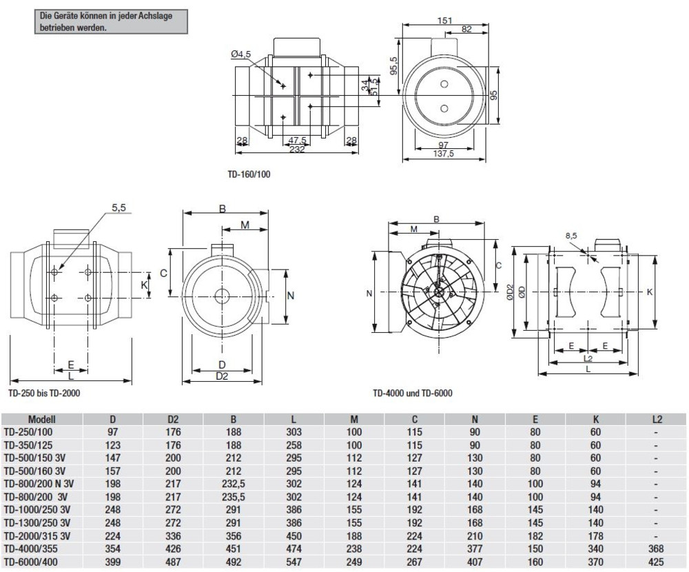 Rohrventilator TD-250/100 -Halbradiale Bauart -Aerodynamisch und akustisch optimiert -Hohes Leistungsvermögen und geräusch- armer Lauf bei kompakten Abmessungen -Gehäuse aus PP-Kunststoff -Laufrad aus ABS-Kunststoff, statisch und dynamisch ausgewuchtet -Komplett mit Montagekonsole und Anschluss-Stutzen NW 100 Für Installations- und Wartungsarbeiten lässt sich die Motoreinheit des Lüfters ohne Demontage der Rohrleitung entnehmen -Asynchron Kondensatormotor aus Aluminiumspritzguss, 2-stufig -Schutzart IP 44 -Wärmeklasse B -Motorbemessung Dauerbetrieb S1 -Geschlossene Kugellager - wartungsfrei -Mit Thermokontakten ausgestattet, manuelle Rückstellung gemäß EN 60335-2-80 -Transformatorisch oder elektronisch drehzahlsteuerbar Technische Daten: Volumenstrom: 240/180 m3/h (freiblasend) Max. Fördermittel- temperatur: -20/+40 GradC Nennspannung: 1ph. 230 V/50Hz Drehzahl: 2.200/1.850 1/min Max. Leistungsaufnahme: 24/18 W Motorstrom: 0,11/0,10 A Schalldruckpegel LPA 3m: 31/26 dB(A) (Gehäuseabstrahlung) Gewicht: 2,0 kg Fabrikat: S&P Deutschland GmbH Typ: TD-250/100 Artikel-Nr.: 5211320600