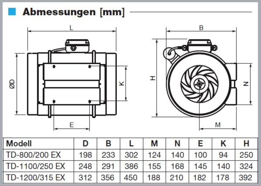 Rohrventilator TD-800/200 Ex -Halbradiale Bauart -Aerodynamisch und akustisch optimiert -Hohes Leistungsvermögen und geräusch- armer Lauf bei kompakten Abmessungen zur bestimmungsgemäßen Verwendung in explosionsgefährdeten Bereichen. EG-Baumusterprüfbescheinigung: gemäß ATEX-Richtlinie 2014/34/EU, II 2 G Ex eb IIB T3 Gb -Gehäuse und Laufrad aus schlagfestem, antistatischem Polypropylen -Komplett mit Montagekonsole und Anschluss-Stutzen NW 200 Für Installations- und Wartungsarbeiten lässt sich die Motoreinheit des Lüfters ohne Demontage der Rohrleitung entnehmen -Asynchron Käfigläufermotor aus Aluminiumdruckguss, eintourig -Schutzart IP 44 -Zulässige Fördermitteltemperatur: -20GradC bis +40GradC -Zündschutzart e: Erhöhte Sicherheit -Für Zone 1 und 2 -Gerätegruppe II, Kategorie 2G -Temperaturklassen T1 bis T3 -Motorbemessung Dauerbetrieb S1 -Geschlossene Kugellager - wartungsfrei -Allpolig wirksamer Motorschutz in Verbindung mit Motorschutzschalter MS-EX -Eine Drehzahlregelung ist nicht zulässig Technische Daten: Volumenstrom: 1.020 m3/h (freiblasend) Nennspannung: 1ph. 230 V/50Hz Drehzahl: 2.450 1/min Max. Leistungsaufnahme: 130 W Motorstrom: 0,54 A Schalleistungspegel LWA: 63 dB(A) Gewicht: 4,9 kg Fabrikat: S&P Deutschland GmbH Typ: TD-800/200 Ex Artikel-Nr.: 5211999800