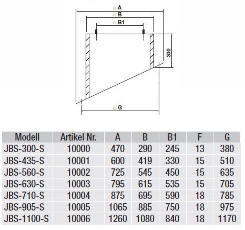JBS-630-S Schrägdachsockel -Schrägdachsockel aus Stahlblech, verzinkt, H=300mm -Thermische/akustische Isolierung -Komplett mit Schrauben und Dichtung -Für Dachneigungen bis 45Grad lieferbar Fabrikat: S&P Deutschland GmbH Typ: JBS-630-S Artikel-Nr.: L012010003