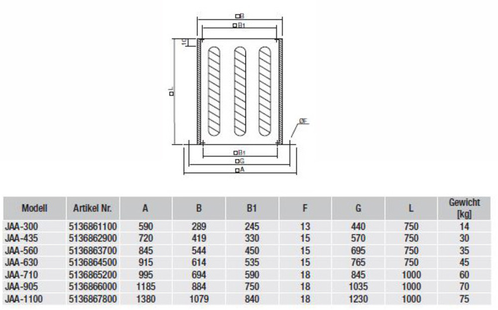 Sockelschalldämpfer JAA-630 -Gehäuse aus Stahlblech, verzinkt -Kulissen aus hochwertiger Mineralwolle, mit abriebfestem Vlies ausgestattet -Nicht brennbar gemäß DIN 4102 -Für Auf- oder Unter-Dachmontage -Komplett mit Montagezubehör und Dicht- band Abmessungen BxTxH mm: 615 x 615 x 750 Schalldämmmaß: 250 Hz 500 Hz 1000 Hz 2000 Hz 4000 Hz 10 dB 16 dB 33 dB 38 dB 33 dB Fabrikat: S&P Deutschland GmbH Typ: JAA-630 Artikel-Nr.: 5136864500
