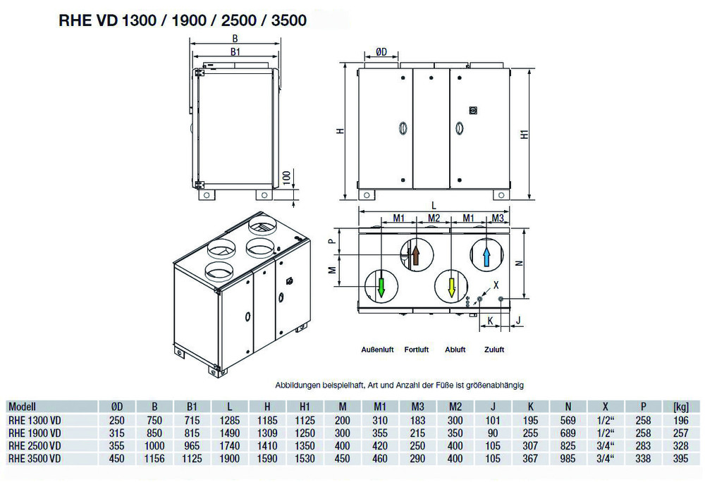 Kompaktlüftungsgerät RHE 700 VD DI mit Rotationswärmetauscher und Elektroheizregister. Vertikaler Luftanschluss. Wirkungsgrad der WRG bis 85Prozent Für Anwendungen im gewerblichen Bereich geeignet. Der Wärmetauscher ist zertifiziert nach EUROVENT. Durch die spezielle Kombination von Wabengröße und deren Anordnung werden optimale Wärmerück- gewinnungsgrade bei günstigen Geräteabmessungen erreicht. Der Standardrotor ist aus einer korrosionsbeständigen Aluminiumfolie. Auf Anfrage mit Sorptions- Beschichtung erhältlich. Mit rückwärtsgekrümmten, hocheffizienten Radiallaufrädern und EC-Motoren mit Thermokontakten ausgerüstet. Geschlossene Kugellager (wartungsfrei). Integrierte Regelung (plug & play) im Lieferumfang enthalten, mit einem Bedienterminal mit Touchdisplay. MODBUS- Protokoll durch RS485 und internem Parameter sowie BACNET IP Kommunikationsprotokoll möglich. Standardregelung (immer im Lieferumfang enthalten) 3 Regelungsarten -CAV - Konstanter Volumenstrom oder -VAV - Variabler Volumenstrom(1) oder -COP - Konstanter Druck(1) (1) Zubehör erforderlich (Sollwertgeber Differenzdruck, Hygrostat...) Selbsttragende Konstruktion, doppelwandig mit 50 mm nicht brennbarer, schall- und wärmedämmender Mineralwollisolierung. Die Wärmeleitfähigkeit beträgt 0,037 W/mK. Außenbeschichtung nach RAL7024, mit Korrosionswiderstand (Klasse RC3) und UV- Strahlenbeständigkeit (Klasse RUV3), gemäß EN 10169. Innenwände aus verzinktem Stahlblech. Aufstellfüße schwarz beschichtet, H=100 mm. Einfacher Zugang zu allen Komponenten durch große Revisionstüren. Schwingungsdämpfer und höhenverstellbare Füße als Zubehör lieferbar. Filter -Abluft M5(ePM10 75Prozent)-Filter -Zuluft G4(ISO coarse 60Prozent)- und F7(ePM1 55Prozent)-Filter -Filterüberwachung durch Druck-Mess- Aufnehmer Geräteeigenschaften: Mechanische Stabilität (DIN EN 1886): Gehäuseklasse D2 Gehäuse-Leckage (DIN EN 1886): Dichtheitsklasse L2 Thermische Isolierung T3 (DIN EN 1886) Wärmebrückenfaktor (DIN EN 1886): Gehäuseklasse TB3 Innere Leckage gemäß EN 13141-7 Klasse C2 (entspricht max 2 Prozent) Kontrollierte Rückführung von Außenluft, beim Übergang (Zu-/Abluft) des Rotationswärmetauschers durch eine Spülzone. Hier wird eine Minimierung der inneren Leckage bei gleichzeitiger Qualitätssicherung der Zuluft und Reinigung des Wärmetauschers erreicht. Wenn der Rotor längere Zeiträume nicht dreht (z.B. Nachtauskühlung bzw. free-cooling ) startet ein Intervallzeitprogramm den Rotor für wenige Sekunden, damit Schmutzablagerungen ausgespült werden. Komplette Rückstellung der eingestellten Betriebsparameter bei Falschparametrisierung mittels einfacher Resetfunktion. Die Kompaktgeräte der Serie RHE werden gemäß den Vorgaben der deutschen Lufthygienenorm VDI 6022 gefertigt. Alle Gerätebereiche sind für Wartungsarbeiten gut zugänglich und einfach zu reinigen. Der Rotationswärmetauscher kann komplett aus dem Gerät heraus gezogen werden. Alle Materialien im Luftstrom wurden sorgfältig ausgewählt, damit eine Beeinträchtigung der Luftqualität ausgeschlossen ist. Technische Daten: Max. Volumenstrom: 900 m3/h Max. Externer Druck: 460 Pa Anschlüsse: d= 250 mm Gewicht 196 kg Schallleistung LWA: 60 dB(A) (Gehäuseabstrahlung) Zu. Fördermitteltemperatur: (-25GradC) - (+40GradC) Nennspannung: 1ph.230 V, 50/60Hz Motoren Leistungsaufnahme: 2 x 200 W Motorstrom: 2 x 1,6 A Wärmeklasse: B Schutzart: IP54 Motorbemessung: S1 Dauerbetrieb Elektroheizregister Leistungsaufnahme: 3 kW Stromaufnahme: 13,1 A Nennspannung: 1ph.230 V, 50/60Hz Fabrikat: S&P Deutschland GmbH Typ: RHE 700 VD DI Artikel-Nr.: 5153705300