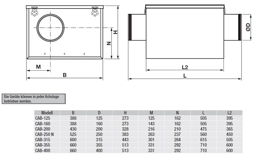 Schallgedämmte Lüftungsbox CAB-250 N -Schallgedämmte Lüftungsbox mit vorwärts gekrümmtem Radiallaufrad -Gehäuse aus Stahlblech, verzinkt -Mit 50 mm Schalldämmauskleidung -Laufrad aus Stahlblech, verzinkt Statisch und dynamisch ausgewuchtet nach ISO 1940 -Ansaug- und Ausblasstutzen NW 250 mit Gummilippendichtung -Deckel zu Revisionszwecken abnehmbar -4 St. Montagehalterungen im Lieferumfang enthalten -Wechselstrommotor 1ph., 230 V, 50Hz, 2-polig, Asynchrone Motoren aus Aluminiumdruckguss -Schutzart IP 44 -Wärmeklasse B -Motorbemessung Dauerbetrieb S1 -Max. zulässige Fördermitteltemperatur -20/40GradC -Geschlossene Kugellager - wartungsfrei -Mit Thermokontakten ausgestattet, manuelle Rückstellung gemäß EN 60335-2-80 -Separater Klemmenkasten (IP 55) mit Anschlusskabel 80 cm -Transformatorisch oder elektronisch drehzahlsteuerbar Technische Daten: Volumenstrom: 1.180 m3/h (freiblasend) Nennspannung: 1ph. 230 V/50Hz Drehzahl: 1.550 1/min Max. Leistungsaufnahme: 395 W Motorstrom: 1,73 A Schalldruckpegel LPA 3m: 36 dB(A) (Gehäuseabstrahlung) Gewicht: 22,0 kg Fabrikat: S&P Deutschland GmbH Typ: CAB-250 N Artikel-Nr.: 5113216500