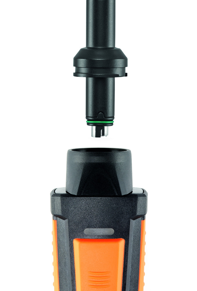 Bitte beachten Sie, dass Sie unseren Adapter (Artikelnummer 0554 2160) benötigen, um Sondenköpfe für Strömungsmessung oder das ausziehbare Teleskop für Strömungsmessung mit dem Handgriff zu verbinden.