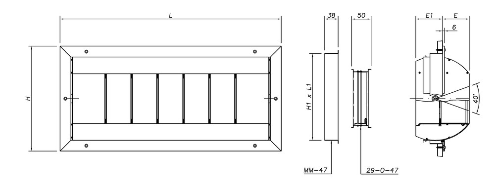 Der Auslass DF-47 mit großer Wurfweite wird vollkommen aus eloxiertem Aluminium mit natürlich aussehender Oberflächenbehandlung gefertigt. Der Auslass umfasst eine Trommel, die eine Drehung der Einheit erlaubt, wodurch es möglich wird, den Einlass-Luftstrom vertikal mit einem Winkel von ±40° einzustellen. Außerdem ist die Einheit mit Leitlamellen ausgestattet, durch die eine fächerförmige, horizontale Luftverteilung oder ein in die gewünschte Richtung konzentrierter Einlassluftstrom ermöglicht werden.