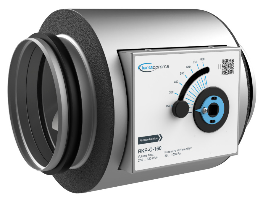 mit 32mm Dämmschale, Rohrmontage inkl. beidseitiger Lippendichtungen, Sollwert außen am Gerät einstellbar, mechanisch selbsttätiges Gerät, arbeitet ohne Hilfsenergie, 160-550 m³/h, empfohlene Strömungsgeschwindigkeit 3 bis 8 m/s bei Druckdifferenz >50 Pa, Typ: KVRR-D32/125