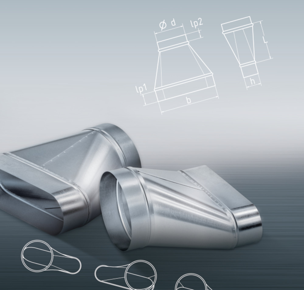m+a Übergang UARO rund-oval, asymm., oben gerade, BxH=260x50mm, auf Durchmesser=100mm, L=130mm 11397054 99542