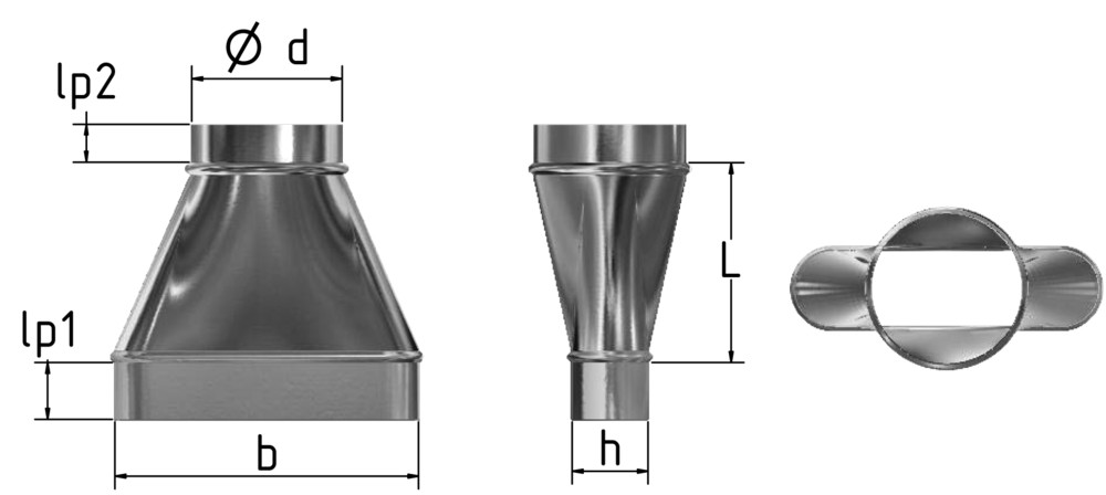 m+a Übergang USRO rund-oval, symm., BxH=195x50mm, auf Durchmesser=125mm, Einbaulänge=100mm 11396935 99542